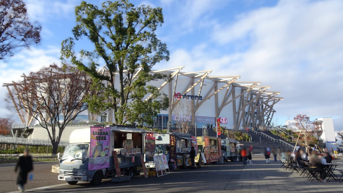会場前にはキッチンカーが4台来ていて、座って食べられる共有テーブルがありました。