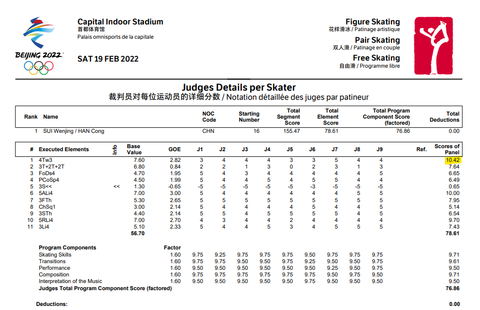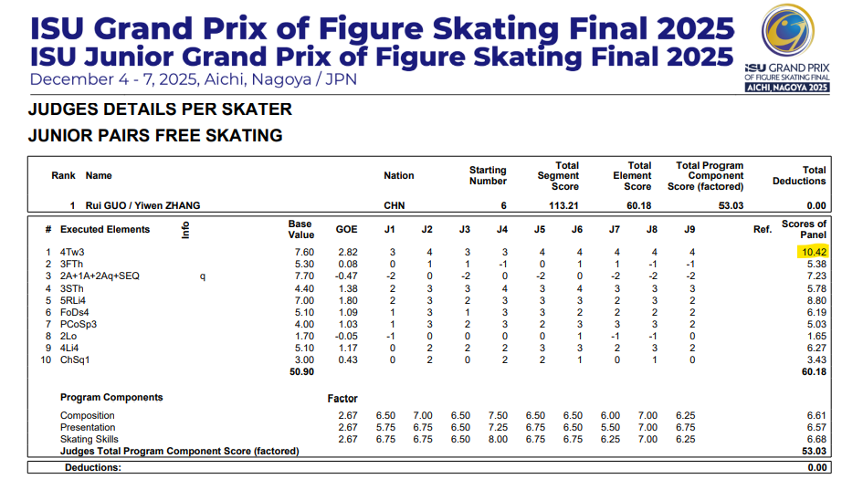 そして、今回Rui Guo & Yiwen Zhang組が決めた4回転ツイストも10.42!それ位精度の高い仕上がりだったということです。