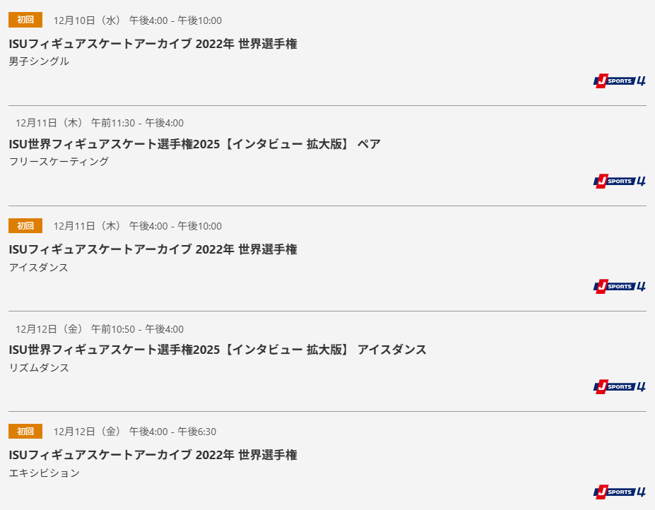 12/10(水)にJSPORTS4にて2022世界フィギュアスケート選手権(モンペリエワールド)男子シングルが再放送されます。今月CS放送契約をされている方は、この際そちらも併せて予約録画するのも手です。