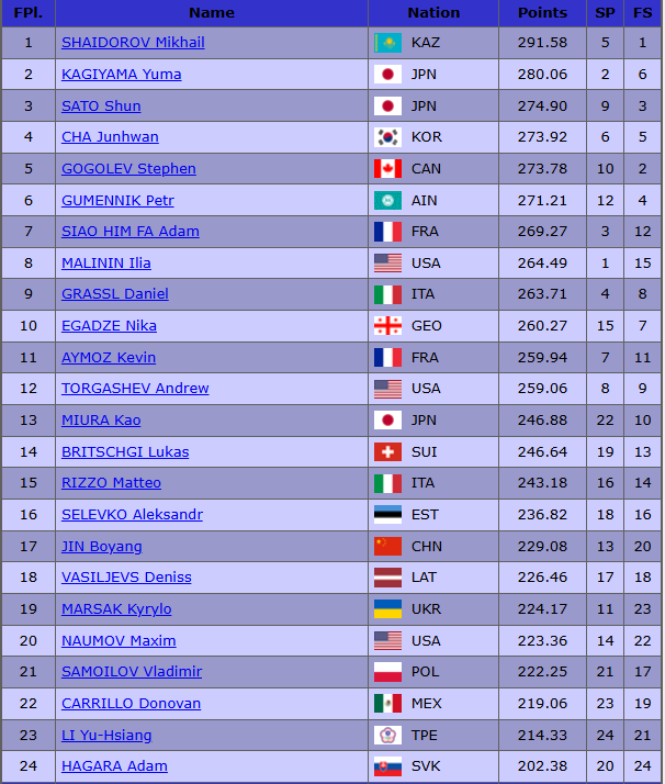 以下が、ミラノ五輪男子シングルの最終結果です。