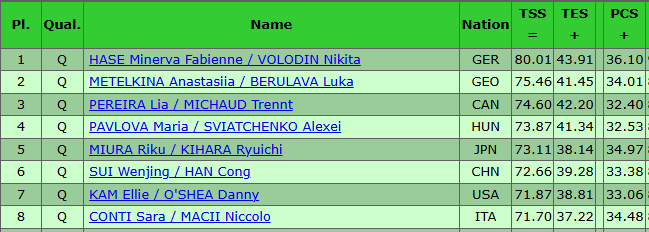 その他、注目選手として挙げていた「パブスビ」ことマリア・パブロワ/アレクセイ・スヴィアチェンコ組(ハンガリー)も73.87とPBを更新する好演技。最終的に最終グループ入りを果たします。
