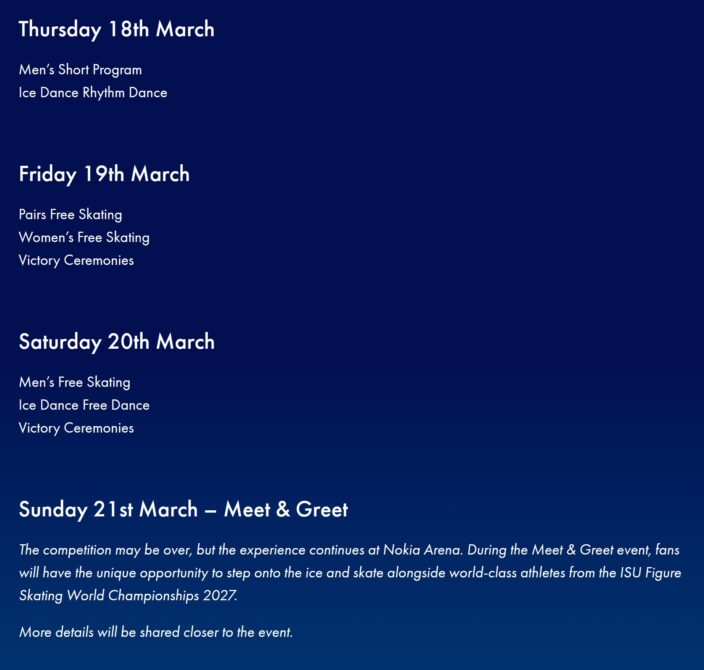 というのも、2027タンペレワールドの公式サイトに掲載されているスケジュールに、現時点ではエキシビションの予定が記載されておらず、選手たちとのミート&グリートを実施する予定だとの情報しか載っていないからです。